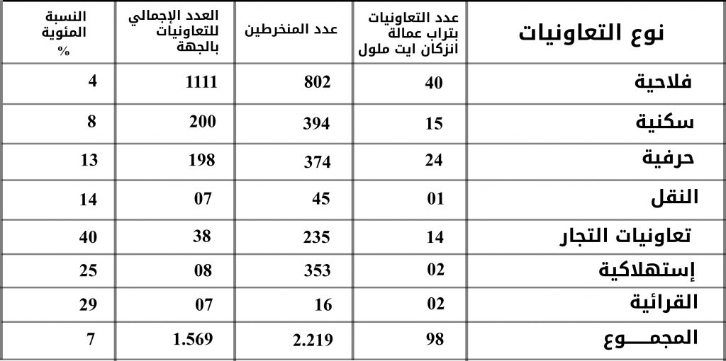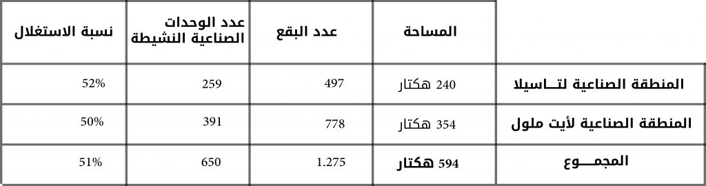 وتتميز الوضعية الاقتصادية للعمالة بنسيج صناعي مهم يتكون من 650 وحدة صناعية نشيطة تشغل زهاء 25.000 من اليد العاملة موزعة على المنطقتين الصناعيتين لتاسيلا وايت ملول كالتالي :