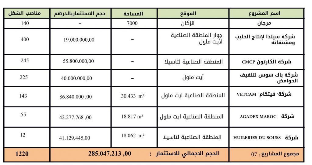 - تتم دراسة المشاريع الاستثمارية المتواجدة خارج المناطق الصناعية في إطار اللجنة الجهوية للاستثمار بأكادير.