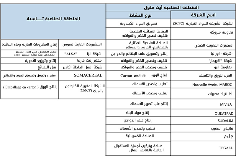 - حرصا على بلورة الأهداف العامة الواردة في الرسالة الملكية السامية حول التدبير اللامتمركز للاستثمار تم إبرام اتفاقيتين للشراكة لتأهيل المنطقتين الصناعيتين لتاسيلا وايت ملول، وقد أعطى صاحب الجلالة والمهابة انطلاقة أشغـال هـذا المشـروع الهـام يـوم 6 نونبر2006، والذي صادف احتفال الشعب المغربي بالذكرى 31 لعيد المسيرة الخضراء، وتبلغ تكلفته 72,49 مليون درهم موزعة كالتالي :